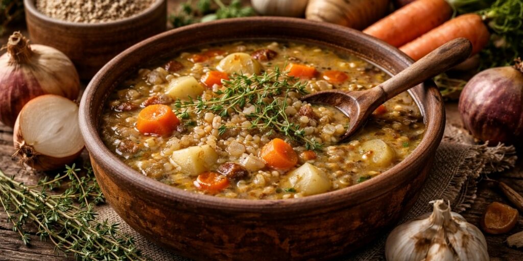 Cette soupe d’épeautre est un concentré de rusticité et de douceur. L’épeautre, céréale ancienne très utilisée par les Gaulois, apporte une texture légèrement ferme et rassasiante. Associé aux légumes racines, il compose un plat complet et équilibré.
