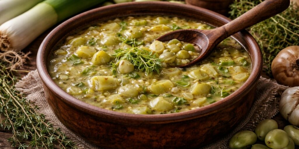 Le poireau apporte une note légèrement sucrée qui équilibre la puissance des fèves. Ce potage est idéal pour les repas hivernaux, simple mais très rassasiant.