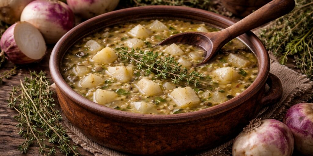 Le navet était un légume central dans la cuisine gauloise. Peu coûteux et résistant, il se prête parfaitement aux soupes longues. Le thym apporte une note aromatique boisée.