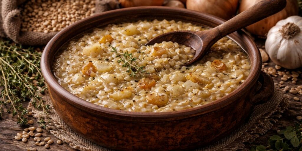 Cette bouillie est à mi-chemin entre soupe et purée. Elle était courante dans les foyers gaulois, utilisant un mélange de céréales. Les oignons apportent douceur et profondeur.