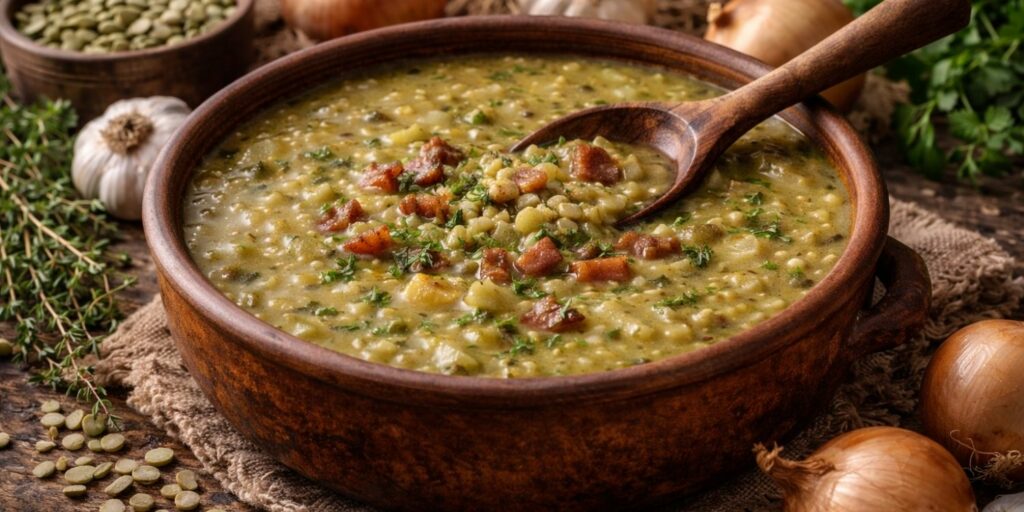 Les pois cassés étaient très répandus dans l’alimentation ancienne. Ce velouté rustique est dense et nourrissant. Il se conserve bien et gagne en saveur avec le temps.