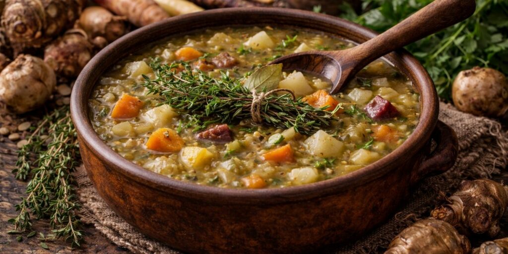 Cette soupe valorise les légumes anciens souvent délaissés aujourd’hui. Elle change selon les saisons et les récoltes. Le bouquet garni structure les saveurs.