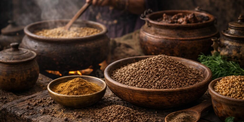 On utilisait le cumin pour aromatiser des bouillies de céréales et des préparations à base d’orge ou d’épeautre. Il pouvait aussi accompagner des viandes mijotées. Son parfum se diffusait facilement lors de la cuisson. Cela permettait de transformer un plat simple en une préparation plus savoureuse. Le cumin jouait donc un rôle discret mais efficace.