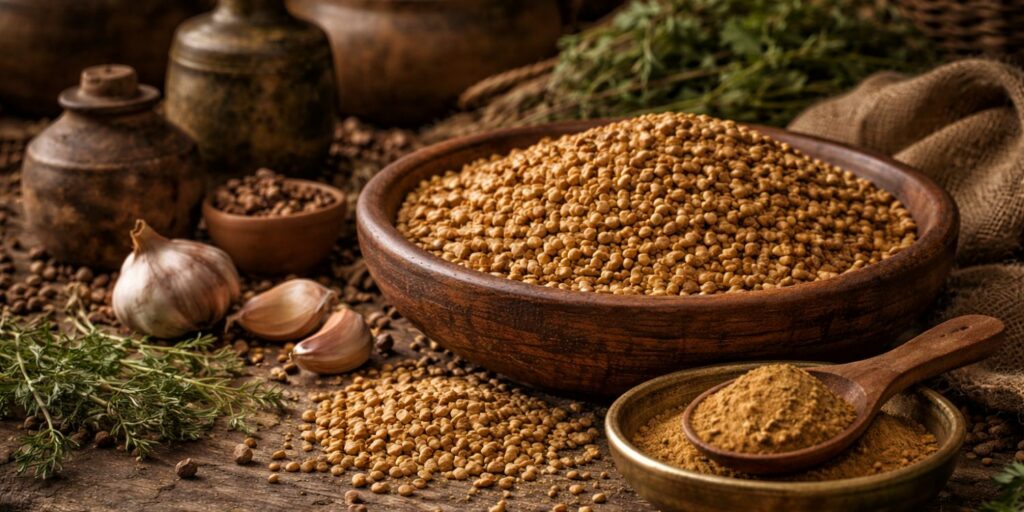 Les graines pouvaient être broyées à l’aide d’un mortier. Une fois réduites en poudre, elles parfumaient sauces et préparations chaudes. Les Gaulois savaient exploiter les ressources végétales pour enrichir leur cuisine. La coriandre faisait partie de ces apports venus d’ailleurs. Elle complétait les herbes sauvages locales.