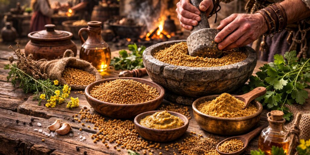 La moutarde illustre le savoir-faire local en matière de transformation alimentaire. Les Gaulois savaient exploiter les plantes sauvages et cultivées. Ils développaient des techniques simples mais efficaces. Cette épice locale montre que leur cuisine n’était pas dépendante uniquement des importations. Elle participait pleinement à l’identité culinaire gauloise.