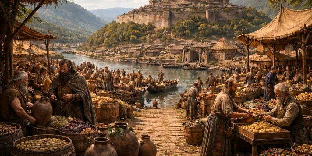 Grâce à sa position géographique, Vesontio était un centre d’échanges majeur. Les produits agricoles circulaient entre les régions : céréales, herbes, légumes, etc. Les artisans locaux fabriquaient des objets en métal et en céramique.