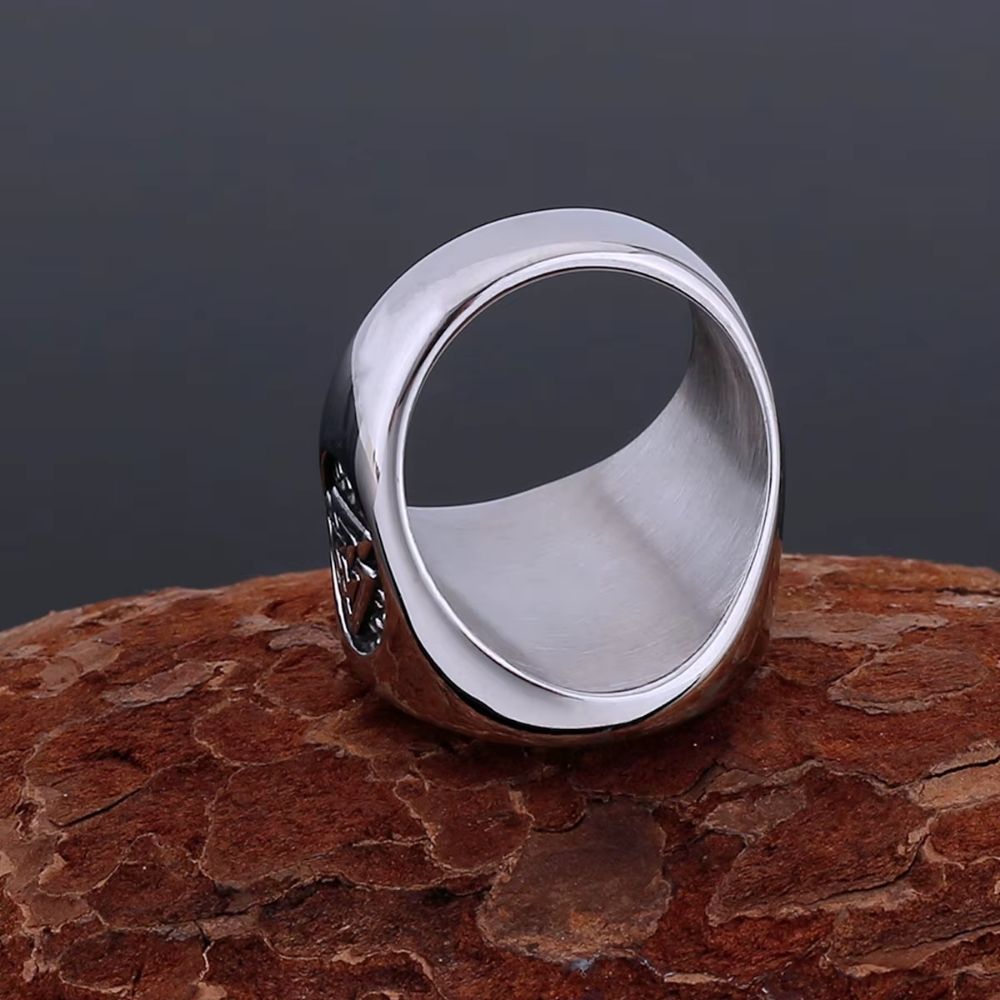 La forme large de la chevalière offre une présence visuelle forte sans compromettre le confort au porté. Le plateau circulaire permet de mettre en valeur les motifs avec clarté. La bague conserve une bonne stabilité sur le doigt. L’ensemble reste équilibré et agréable à porter.