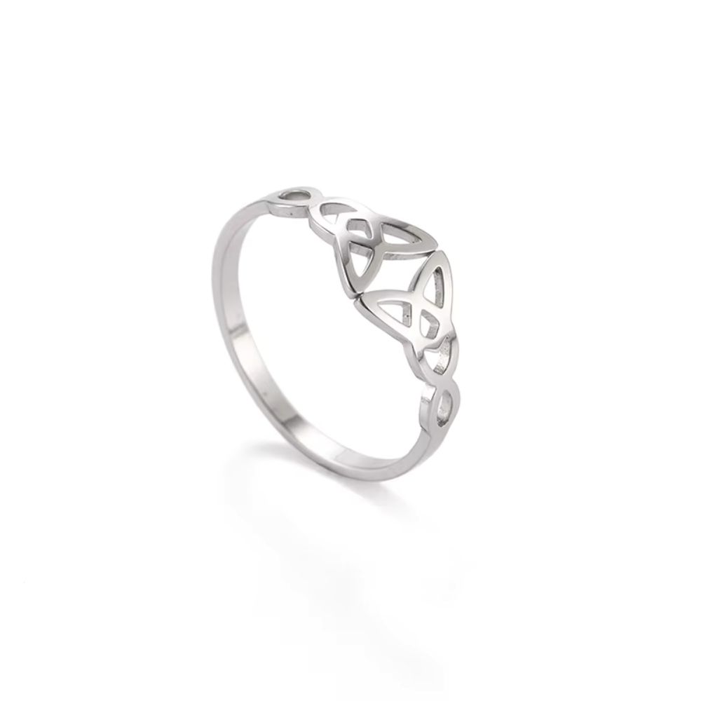 Cette bague gauloise met en avant une composition fluide de triquetras enchaînés, créant un motif continu qui épouse naturellement la forme de l’anneau. La finesse des lignes apporte une légèreté visuelle tout en conservant une bonne lisibilité du symbole. La finition argentée renforce la clarté du design. L’ensemble offre un équilibre entre discrétion et identité visuelle marquée.