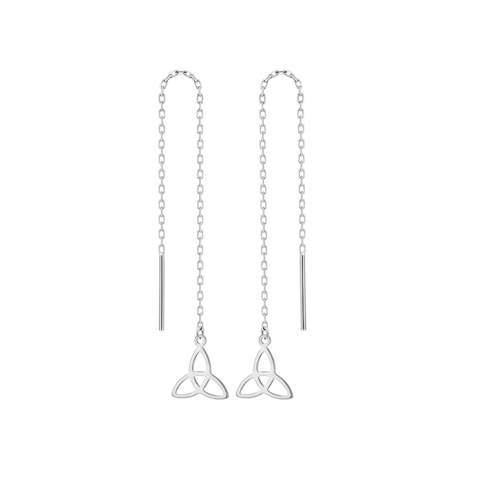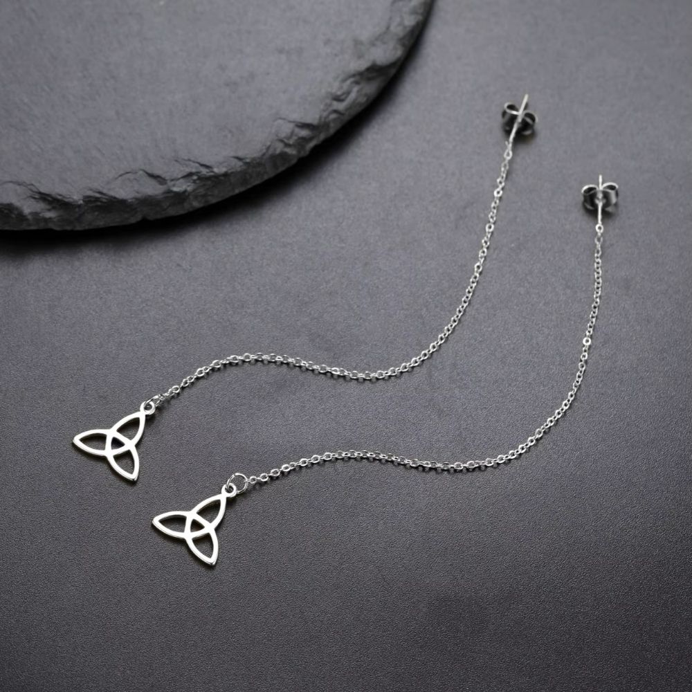 Ces boucles d’oreilles gauloises pendantes argentées adoptent un style plus fin et allongé, combinant la délicatesse d’une chaîne légère avec la symbolique forte du triquetra. Le motif, suspendu avec élégance à l’extrémité, semble flotter avec légèreté, créant un mouvement subtil à chaque geste. Cette conception apporte une dimension aérienne au bijou, renforçant son élégance naturelle. La finesse de la chaîne contraste avec la structure du symbole, offrant un équilibre visuel particulièrement réussi. L’ensemble crée une pièce à la fois discrète et expressive, idéale pour celles et ceux qui recherchent un bijou raffiné capable d’apporter une touche de dynamisme à leur style.