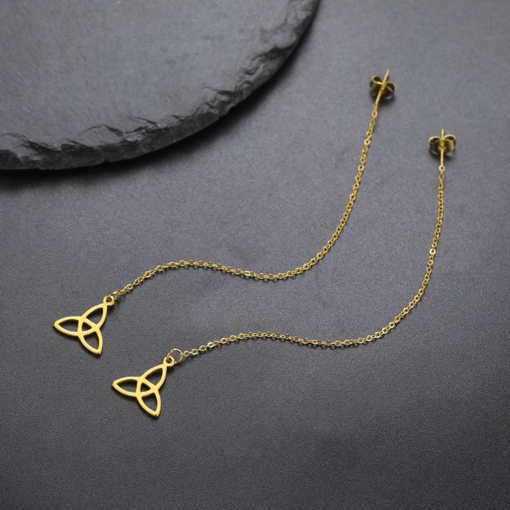 Ces boucles d’oreilles gauloises pendantes dorées reprennent la même structure fine et élégante, en y ajoutant une touche de chaleur grâce à leur finition dorée. Le contraste entre la finesse de la chaîne et la présence du motif triquetra crée un équilibre visuel particulièrement séduisant. Le symbole semble suspendu dans le vide, apportant une sensation de légèreté et de mouvement. La teinte dorée vient enrichir l’ensemble en lui donnant une luminosité plus marquée, idéale pour rehausser une tenue avec subtilité. Ce bijou combine ainsi finesse, mouvement et éclat dans une composition harmonieuse.