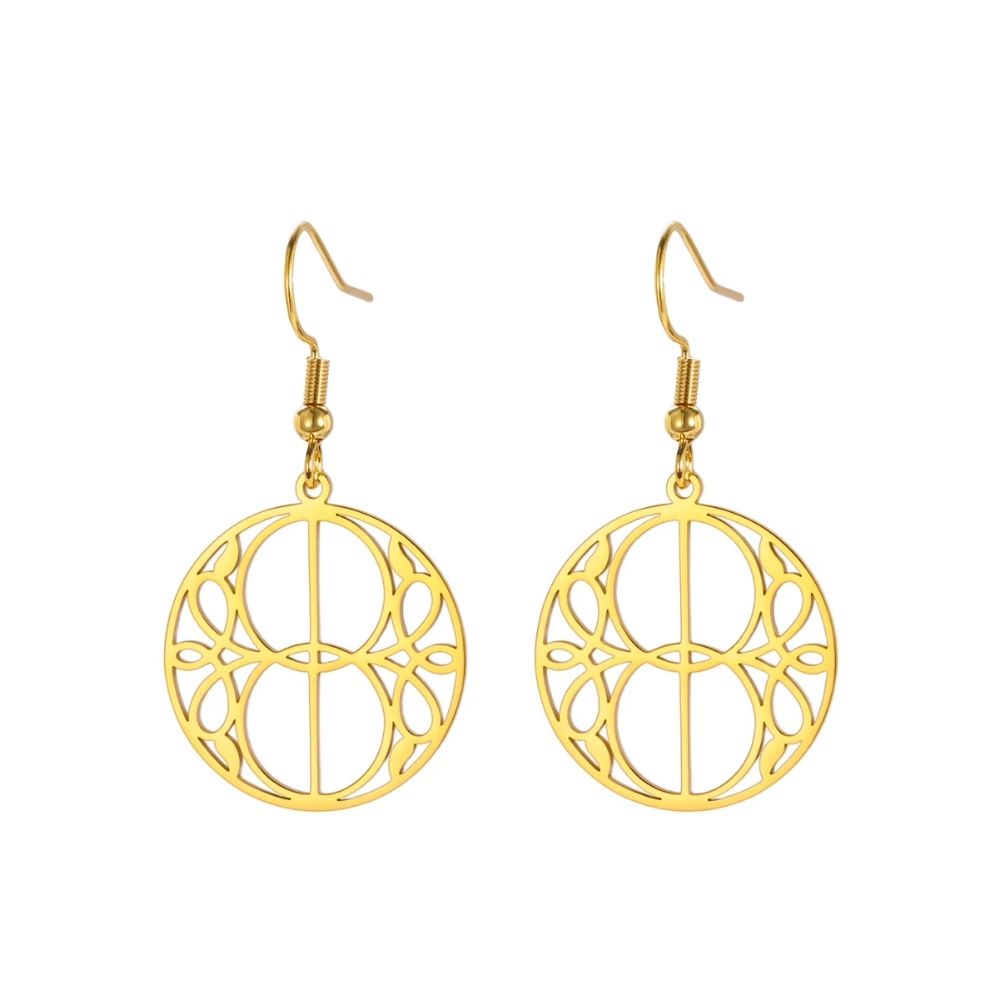 Ces boucles d’oreilles gauloises dorées reprennent une structure circulaire enrichie de motifs ajourés élégants. Leur design repose sur un équilibre entre lignes géométriques et formes organiques, créant une composition visuelle riche mais maîtrisée. La finition dorée accentue les détails et apporte une touche lumineuse qui rehausse immédiatement une tenue.
