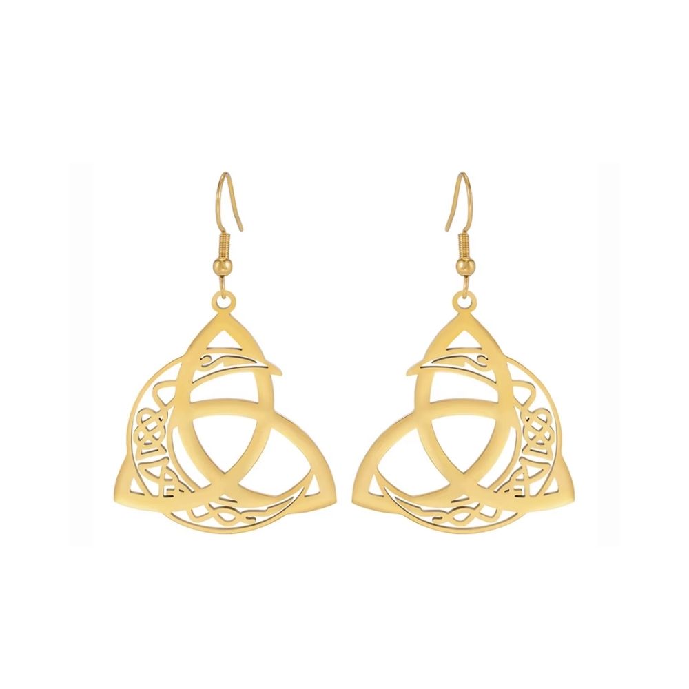 Ces boucles d’oreilles gauloises dorées reprennent un design triquetra enrichi, où les entrelacs se multiplient pour créer une composition plus dense et décorative. La finition dorée accentue la richesse du motif, mettant en valeur chaque détail avec une luminosité chaleureuse. L’ensemble offre un bijou visuellement captivant, capable d’attirer le regard tout en restant élégant. Leur conception ajourée garantit un port confortable, même sur une longue durée.