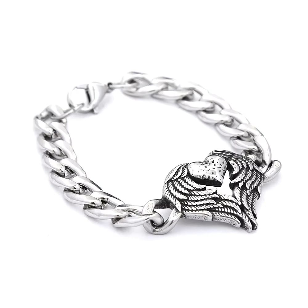 Le cœur ailé apporte une dimension visuelle forte, avec des détails sculptés qui renforcent son impact. Il attire le regard sans déséquilibrer l’ensemble. Ce motif donne au bracelet une identité unique.