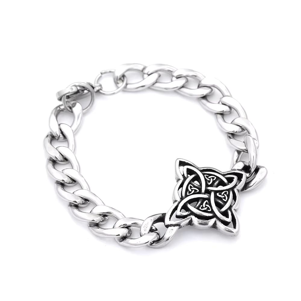 Ce bracelet gaulois en chaîne argentée se caractérise par son symbole central en forme étoilée, composé d’entrelacs qui créent un effet visuel riche et structuré. La chaîne apporte une base solide et continue, tandis que le motif central capte le regard par sa complexité. L’ensemble offre un équilibre entre force visuelle et cohérence esthétique.