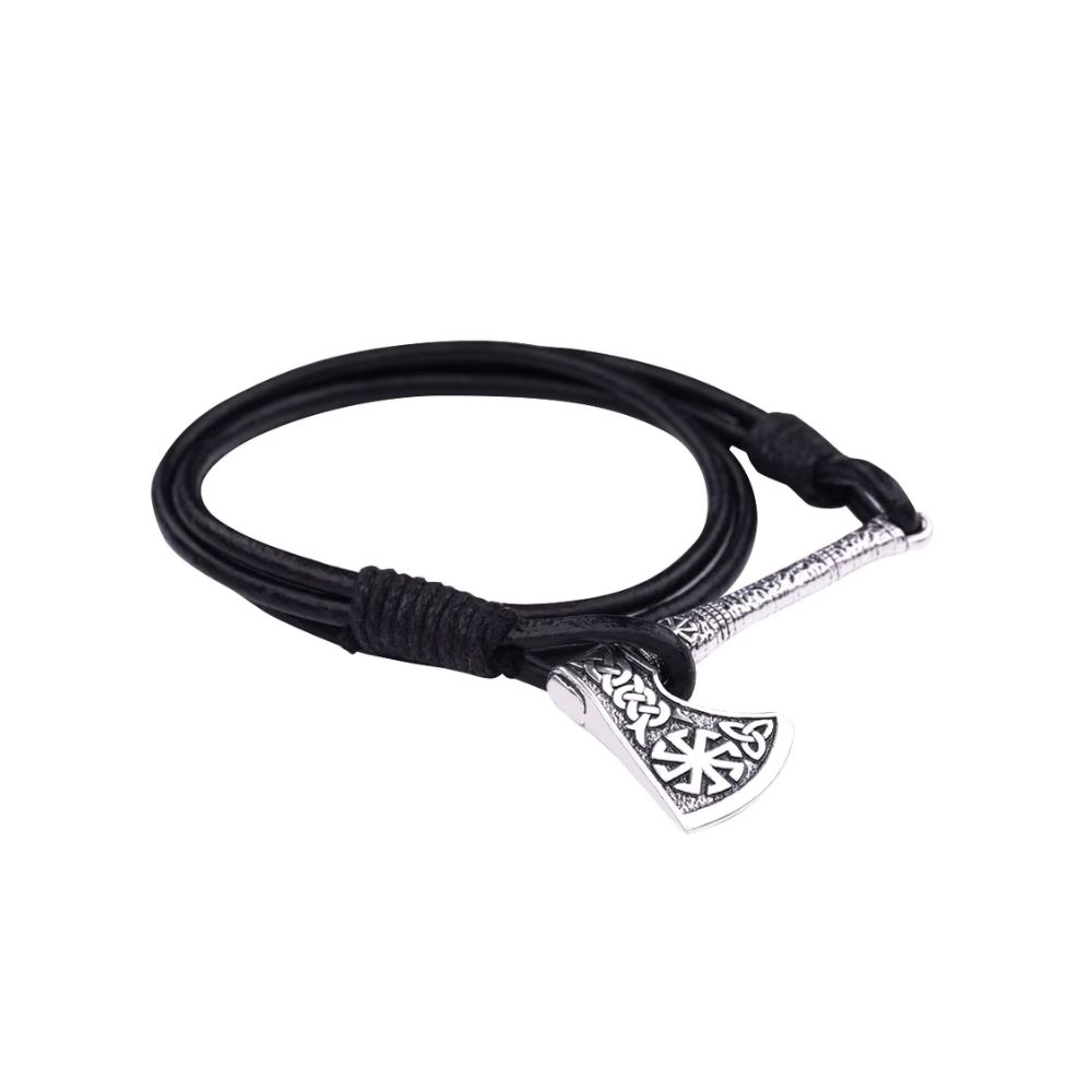 Ce bracelet gaulois reprend la combinaison cuir et métal avec une hache ornée d’un symbole nordique distinct, apportant une variation visuelle intéressante. Le cordon noir entoure le poignet avec souplesse tandis que la pièce centrale capte le regard. L’ensemble propose un équilibre entre simplicité et détail. Le design reste cohérent et structuré.