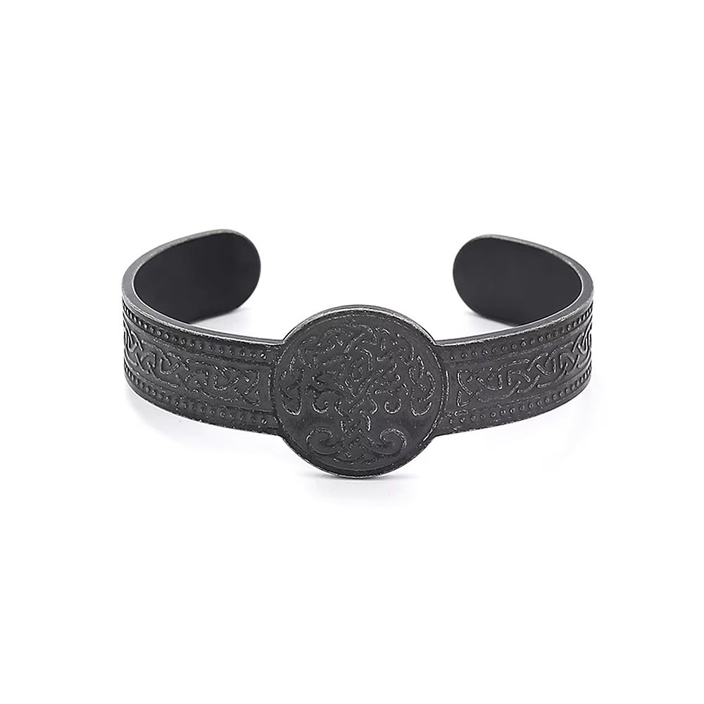 Ce bracelet gaulois reprend le design avec médaillon central, en adoptant une finition plus sombre qui accentue le contraste des motifs. Le jonc conserve une structure simple, laissant toute l’attention se porter sur l’élément central. L’ensemble offre un bijou plus marqué visuellement, avec une présence renforcée.
