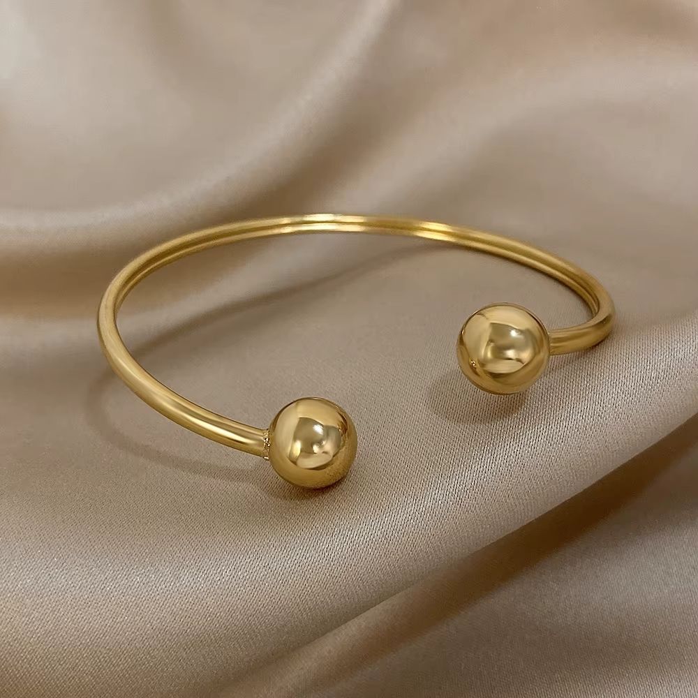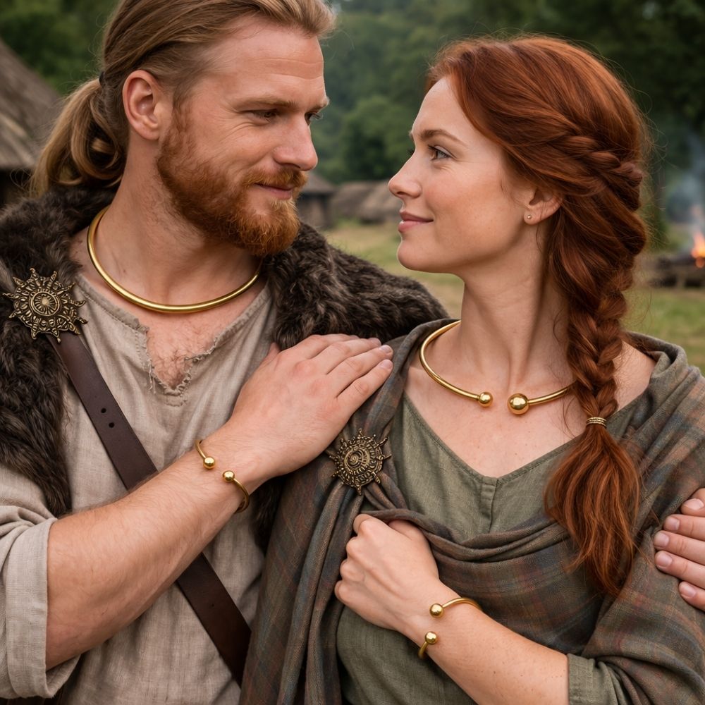 Ce bracelet torque gaulois lisse doré ouvert présente une structure simple sans texture apparente avec des extrémités sphériques qui renforcent l’équilibre visuel de l’ensemble. La forme reste circulaire. Le métal est brillant. L’ensemble évoque une parure inspirée des traditions gauloises, combinant simplicité, clarté et présence visuelle sans surcharge décorative excessive.