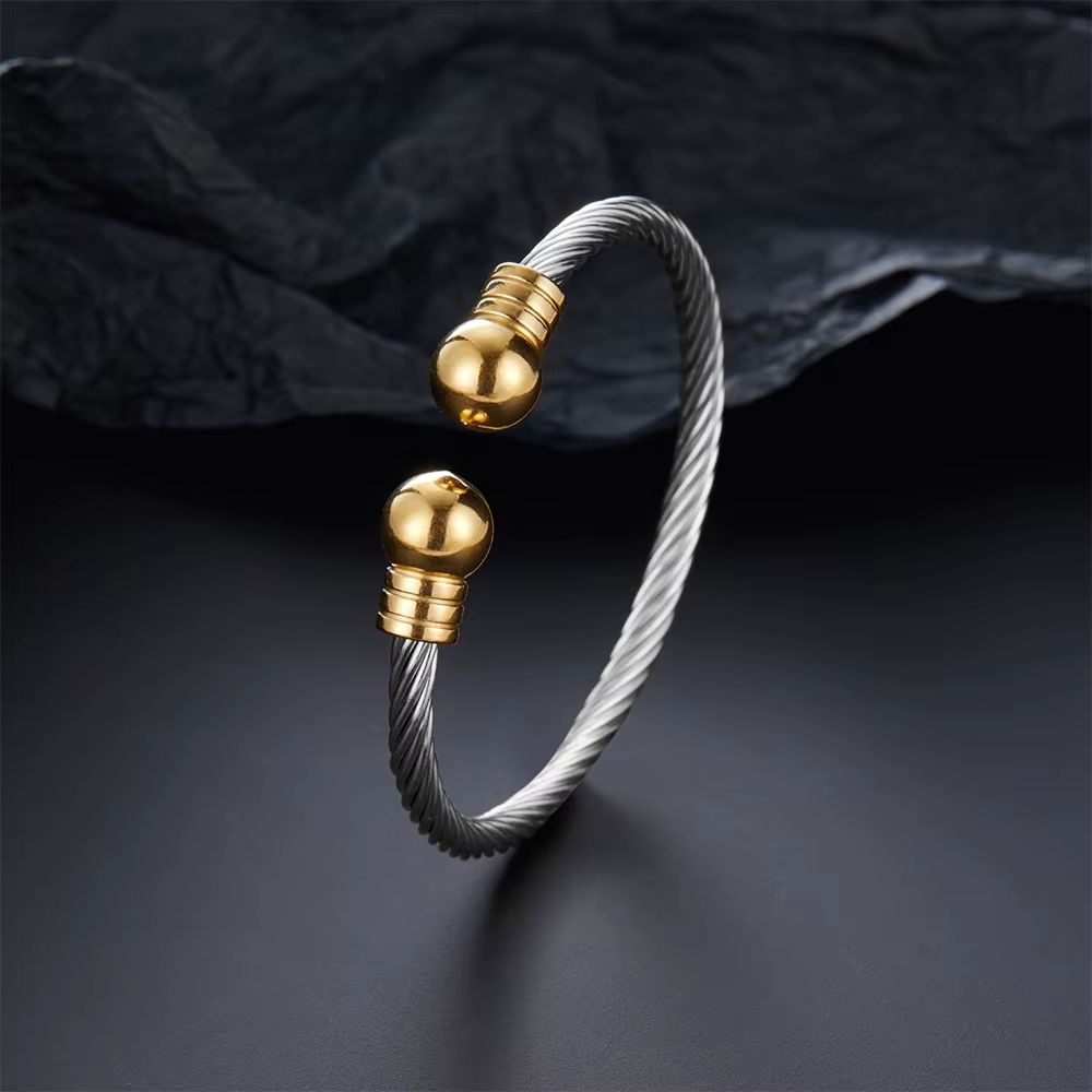 Ce bracelet torque gaulois torsadé bicolore ouvert présente une structure rigide composée d’un câble torsadé associé à des extrémités sphériques dorées qui contrastent avec la teinte principale du métal. La forme reste circulaire. Le rendu capte la lumière. L’ensemble évoque une parure inspirée des traditions gauloises, combinant texture, contraste et présence visuelle sans surcharge décorative excessive.