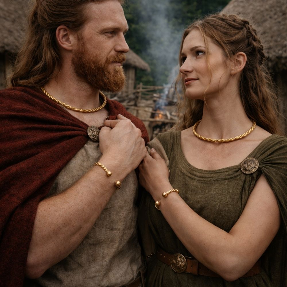 Ce bracelet torque gaulois torsadé doré épais ouvert présente une structure tressée plus marquée qui renforce la présence visuelle tout en conservant une forme circulaire stable et équilibrée. La ligne reste dense. Le métal capte la lumière. L’ensemble évoque une parure gauloise affirmée, combinant volume, texture et présence visuelle sans surcharge décorative excessive.