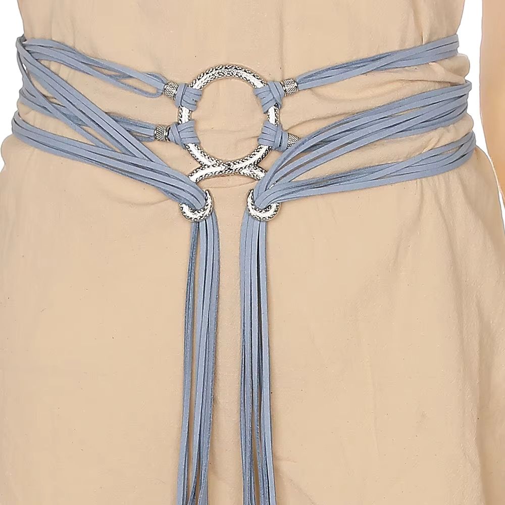 Cette ceinture gauloise à lanières multiples se distingue par son système d’entrelacement autour d’un anneau central décoratif, créant une structure à la fois souple et visuellement structurée. Les lanières fines permettent un ajustement libre tout en conservant une bonne tenue autour de la taille. L’ensemble évoque les accessoires utilitaires et ornementaux inspirés des traditions celtiques anciennes, avec une approche fonctionnelle et adaptable.