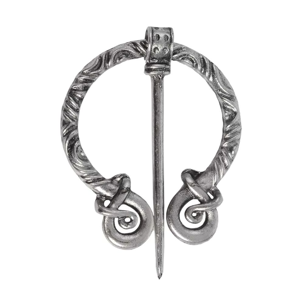 Cette fibule gauloise argentée se distingue par ses extrémités en spirales élégantes et son anneau finement décoré. Elle combine harmonieusement des formes dynamiques et une structure équilibrée, offrant un accessoire à la fois esthétique et fonctionnel. Son allure raffinée en fait une pièce idéale pour enrichir une tenue avec subtilité.