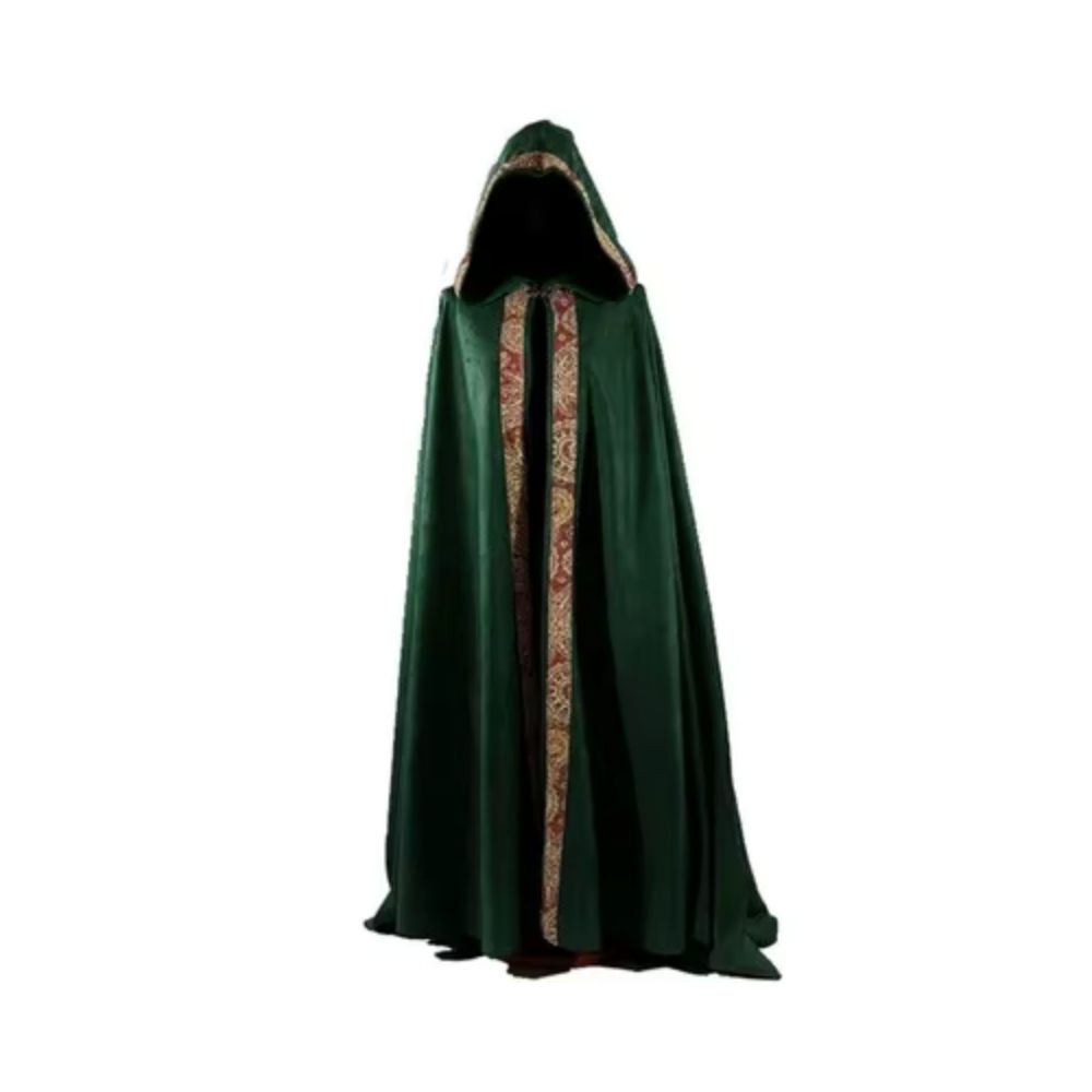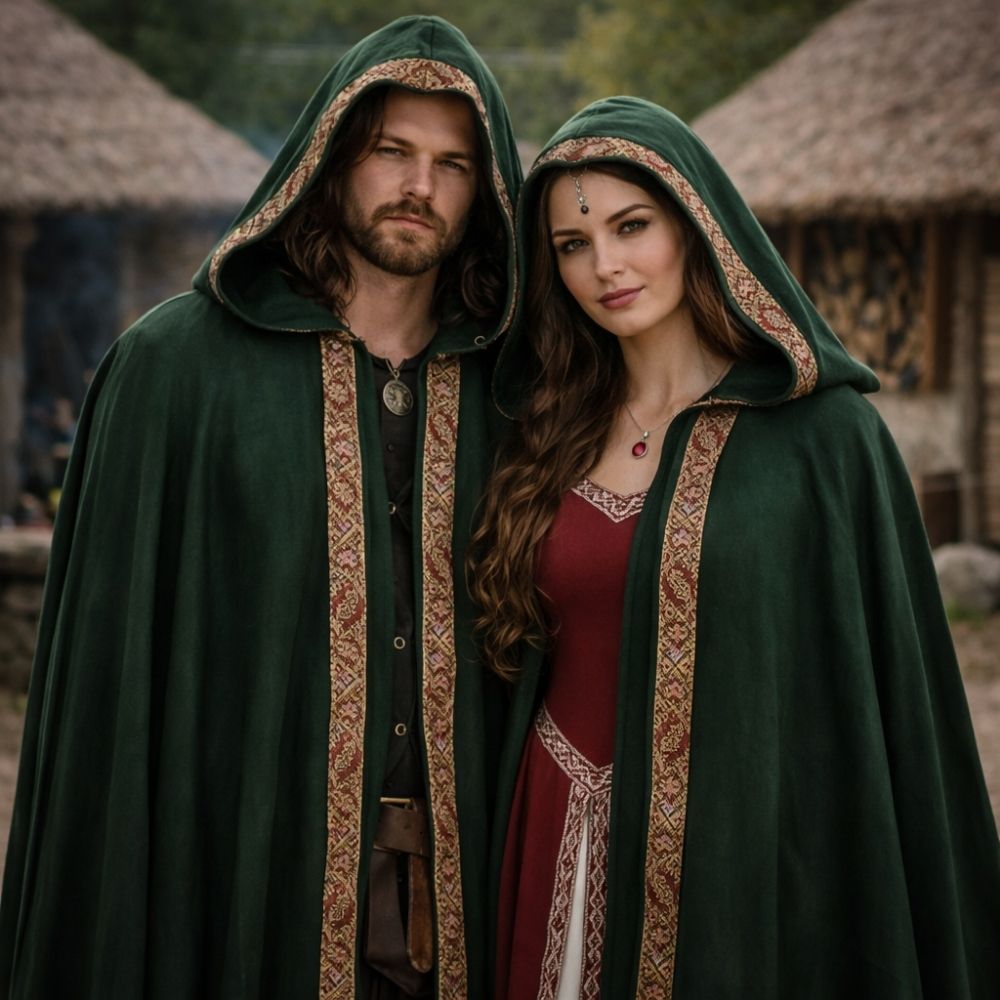 Ce manteau gaulois à capuche adopte une coupe ample et fluide avec une teinte verte qui évoque un aspect naturel et organique. Le tissu enveloppe le corps tout en permettant une grande liberté de mouvement. Les bordures décoratives structurent visuellement l’ouverture. L’ensemble propose un vêtement inspiré des traditions anciennes avec une approche fonctionnelle et équilibrée.
