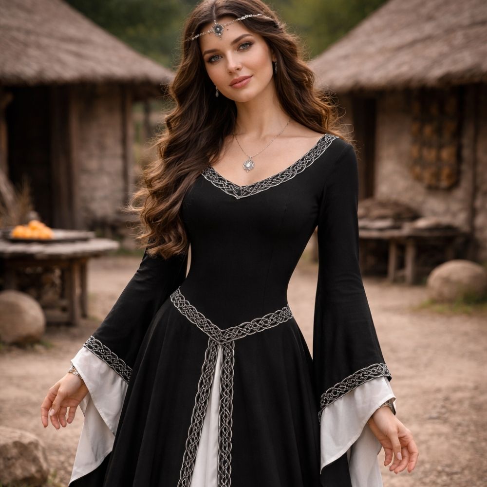 Cette robe gauloise noire présente une coupe longue et fluide accompagnée de manches larges qui accentuent l’amplitude du vêtement tout en conservant une structure simple. Les bordures décoratives soulignent les lignes principales sans alourdir l’ensemble. Le tissu tombe naturellement le long du corps. L’ensemble évoque un vêtement inspiré des traditions anciennes, combinant aisance de mouvement et présence visuelle équilibrée.