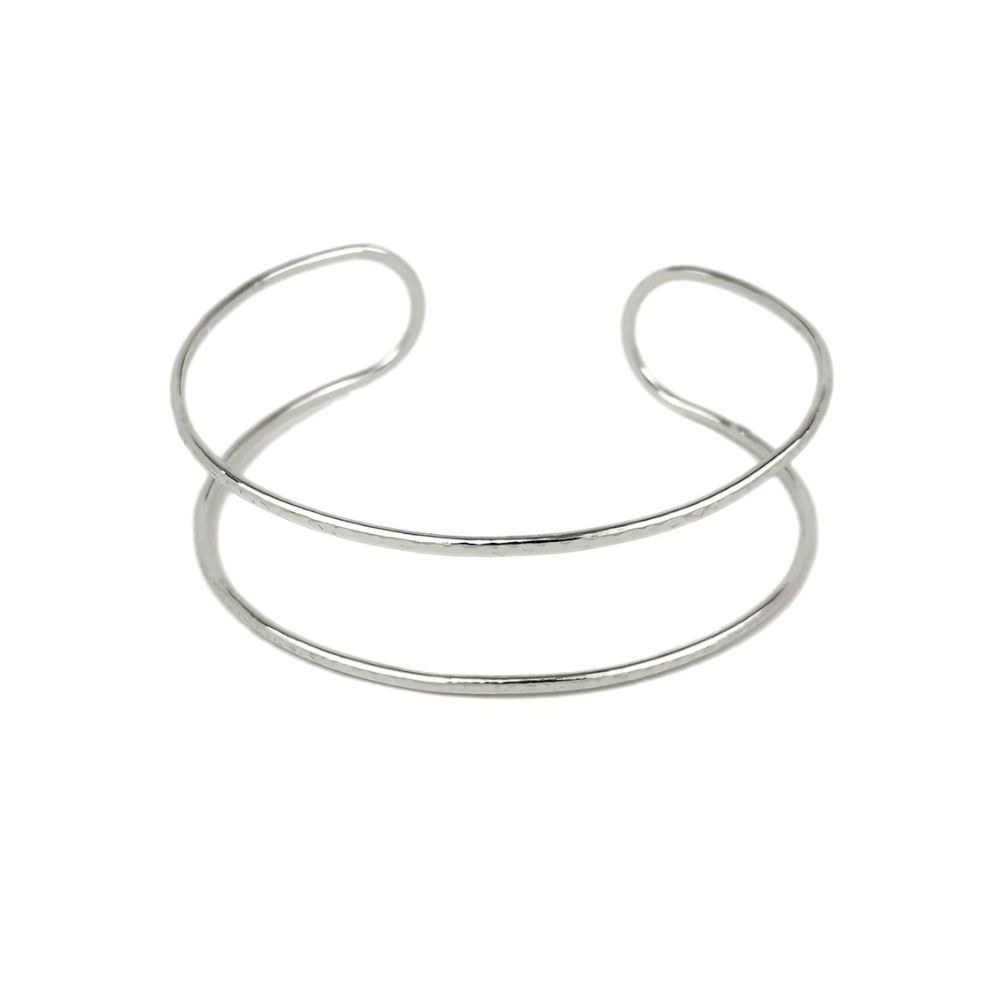 Ce torque gaulois double anneau argent ouvert reprend une structure similaire avec une finition argentée qui met en valeur les lignes parallèles et le volume du bijou tout en conservant une esthétique sobre. La forme reste fluide. Le métal est homogène. L’ensemble évoque une parure gauloise modernisée, combinant simplicité, structure et équilibre visuel sans surcharge décorative.