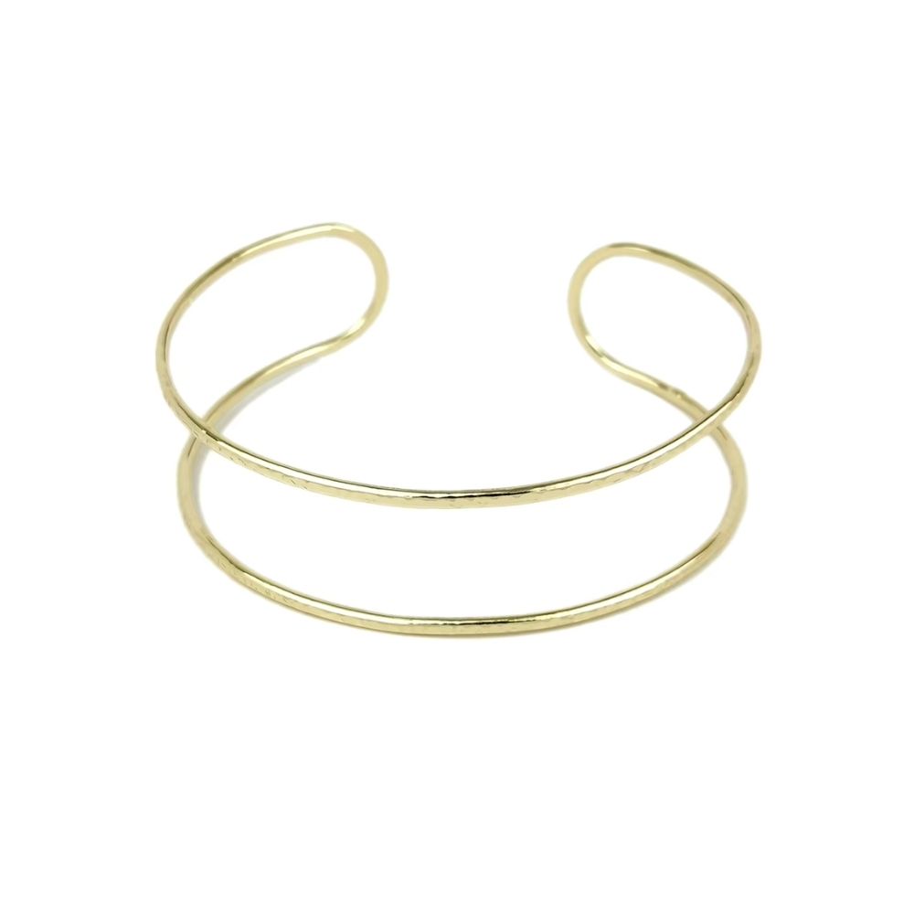 Ce torque gaulois double anneau doré ouvert présente une structure composée de deux lignes parallèles qui créent un effet de superposition tout en conservant une forme circulaire cohérente. La courbure reste fluide. Le métal est lumineux. L’ensemble évoque une interprétation gauloise revisitée, combinant volume, simplicité et présence visuelle structurée sans surcharge décorative.
