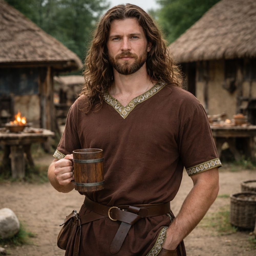 Cette tunique gauloise marron reprend une structure simple avec des finitions brodées qui encadrent le col, les manches et le bas du vêtement. La teinte chaude renforce son aspect traditionnel. La ceinture permet d’ajuster la taille selon les préférences. L’ensemble reste pratique et visuellement équilibré.