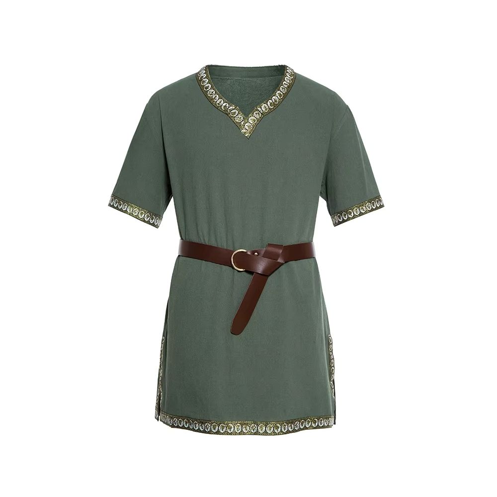 Cette tunique gauloise verte se distingue par son allure naturelle et ses finitions brodées qui soulignent le col, les manches et la base du vêtement. Sa couleur inspirée des tons végétaux lui confère un style authentique et vivant. La ceinture intégrée permet d’ajuster facilement la silhouette pour un porté confortable et adaptable.