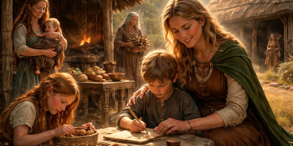 Elles jouaient également un rôle clé dans l’éducation des enfants, en leur transmettant les valeurs du clan, les règles de vie et les premiers savoirs. Leur présence influençait profondément la formation des jeunes Gaulois, tant sur le plan moral que culturel.